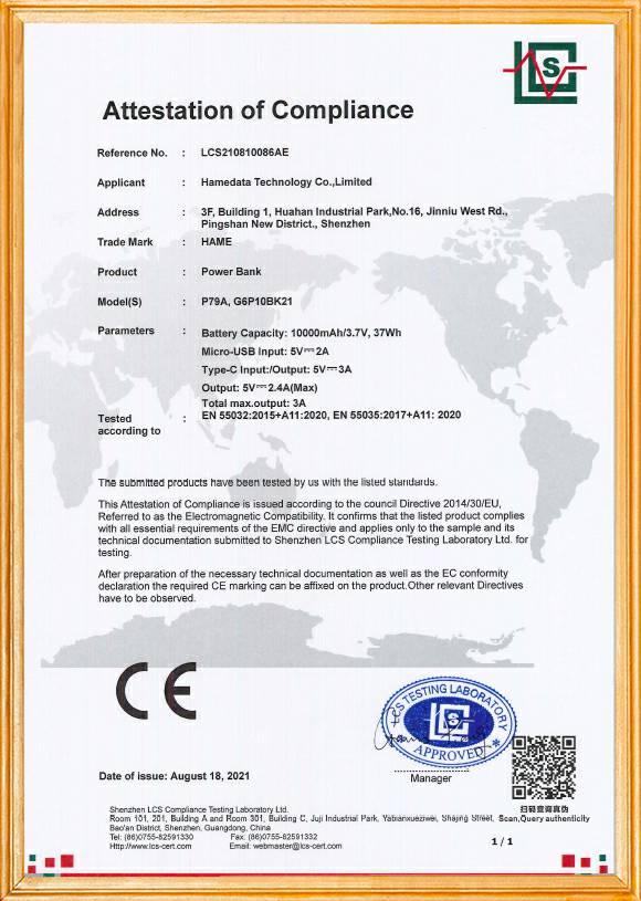 移动电源产品品质证书1